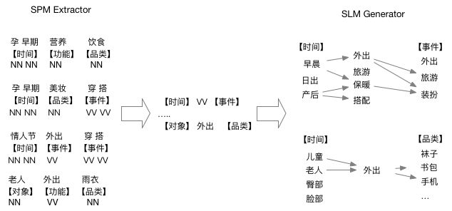 在明确了定义和基本原则之后,我们需要挖掘大量的concept用以覆盖各式各样的用户需求。目前,我们认为用户在使用淘宝或天猫搜索时输入的搜索词(query)和商品的标题(title)是concept挖掘可以利用的最大来源。而我们的工作主要是要将满足我们上述原则的concept短语,从充满噪音的query、title中挖掘出来,这一步称为“Concept Mining”。