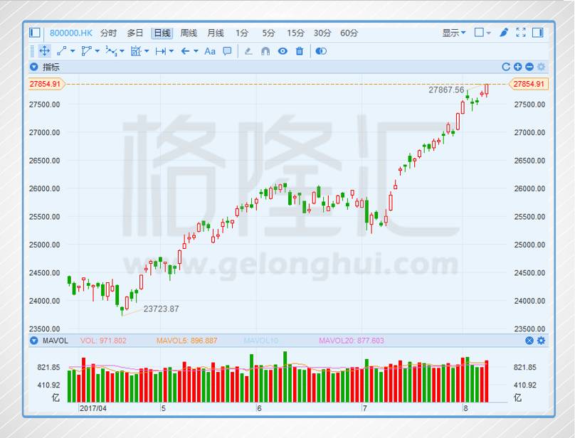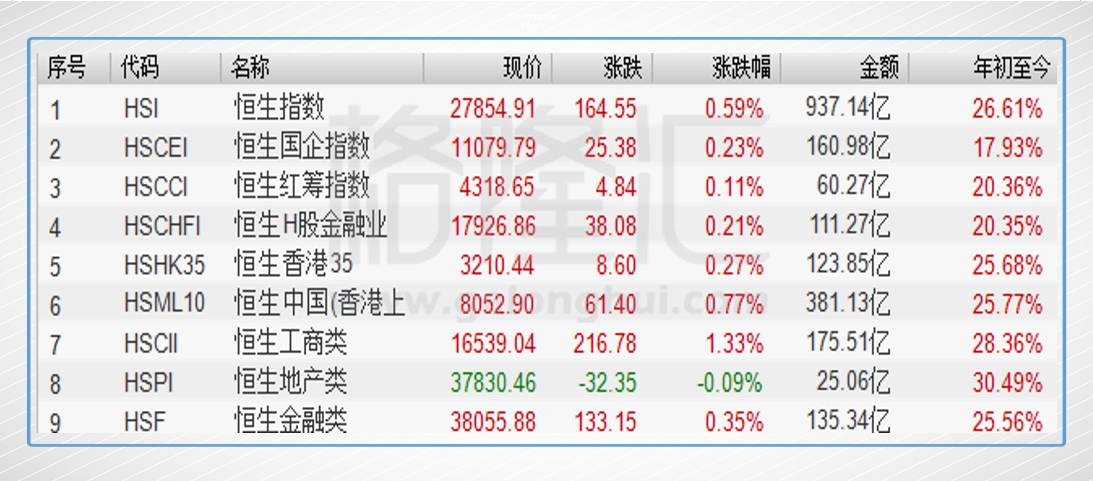 周二港股市场三大指数继续收涨,其中恒指收报27854点,涨0.59%,盘中最高一度达27867点,逐步逼近28000点大关;国企指数收报11079点,涨0.23%;红筹指数收报4318点,涨0.11%。