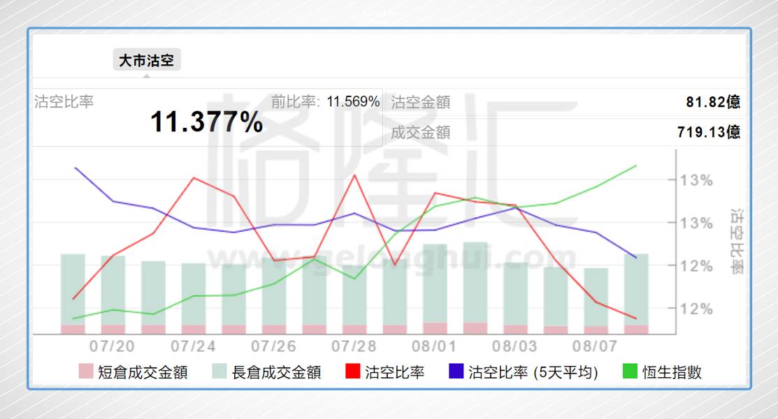 港股今日沽空金额81.82亿港元,大市沽空比率11.377%,较上一个交易日(12.055%)降0.678%。