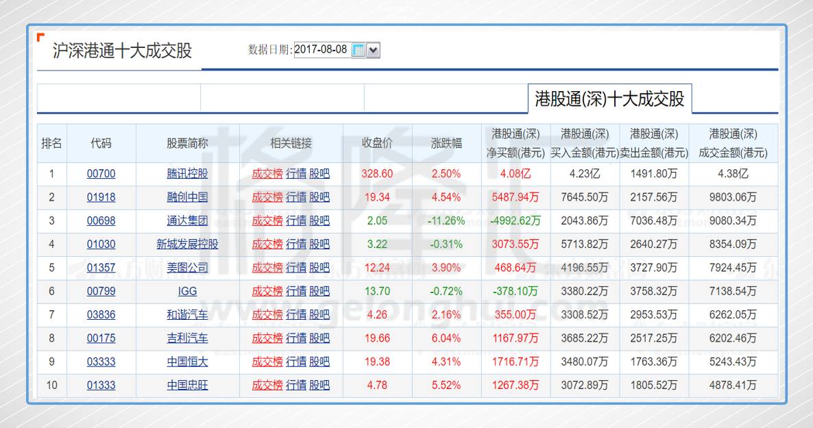今日港股通(深)前十大成交个股是腾讯控股、融创中国、通达集团、新城发展控股、美图公司、IGG、和谐汽车、吉利汽车、中国恒大、中国忠旺。其中净流入最多的个股是腾讯,净流入4.08亿;净流出最多的个股是通达集团,净流出4992.62万。
