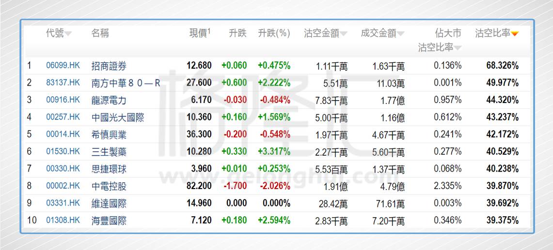 今日前10位沽空比率最高的个股分别是招商证券(06099.HK)、龙源电力(00916.HK)、中国光大国际(00257.HK)、希慎兴业(00014.HK)、三生制药(01530.HK)、思捷环球(00330.HK)、中电控股(00002.HK)、维达国际(03331.HK)、海丰国际(01308.HK)、数码通电讯(00315.HK)。