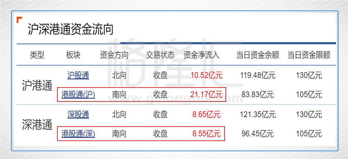 大市今日共成交971.8亿港元,逼近千亿水平。南下资金今日净流入29.72亿元,净流入水平重回30亿附近;其中港股通(沪)净流入21.17亿元,港股通(深)净流入8.55亿元。港股通全天共成交110.81亿港元,占总成交额的比例为11.41%,继续保持两位数水平。