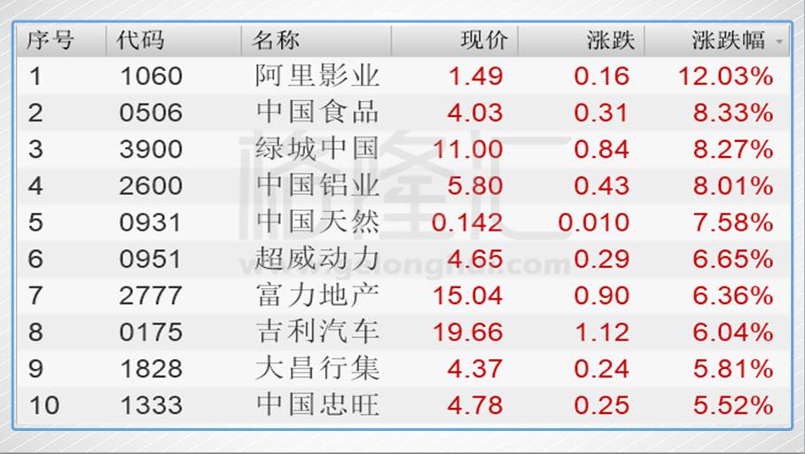 今日港股通标的中涨幅前五的个股是阿里影业(01060.HK)、中国食品(00506.HK)、绿城中国(03900.HK)、中国铝业(02600.HK)、中国天然气(00391.HK)。
