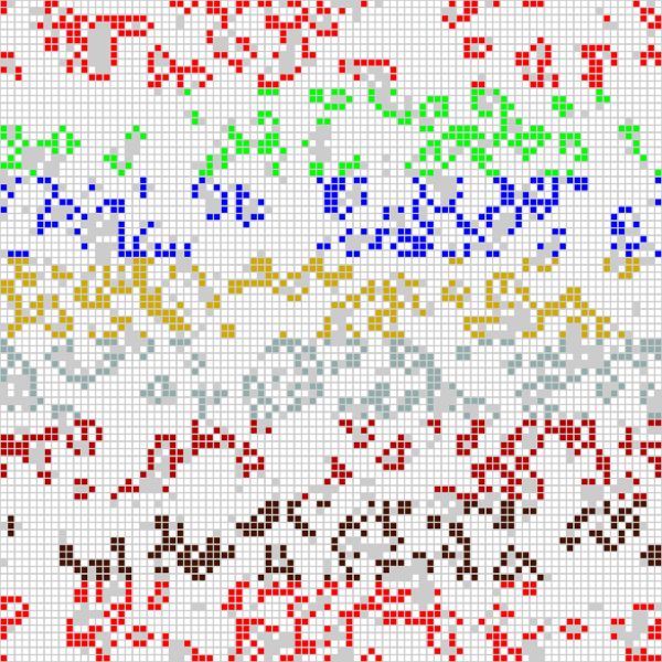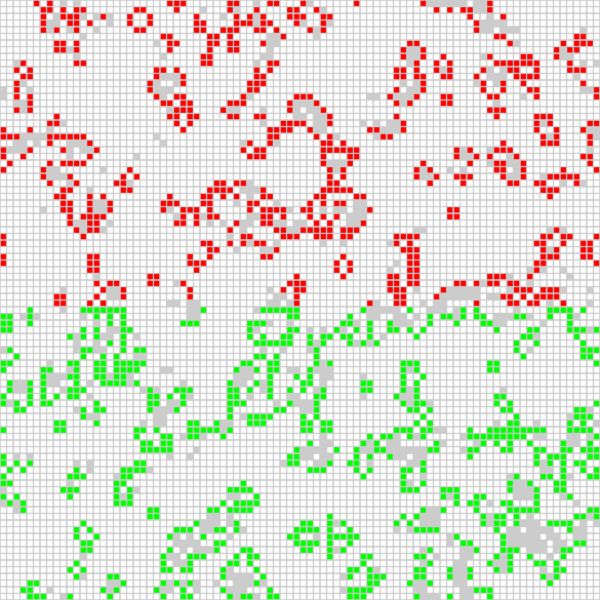 红色单元格是由其中一个计算节点来计算的,而绿色单元格是由另外一个计算节点来计算的。我也可以让康威生命游戏程序为使用的每个 CPU 核心(这里的每个计算节点有四个核心)去生成不同的颜色,这样它的输出如下:
