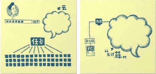 于是人们突然想到了一个好办法:把所有计算资源集结起来看成是一个整体(一朵云),每个操作请求都可以按照一定的规则分割成小片段,分发给不同的机器同时运算,每个机器其实只要做很小的计算就可以,哪怕是很落后的机器都能轻松完成。