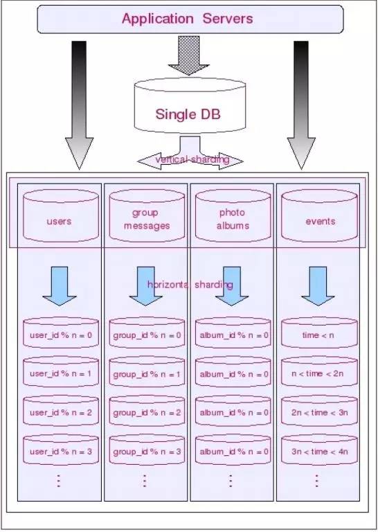 Sharding的基本思想就要把一个数据库切分成多个部分放到不同的数据库(server)上,从而缓解单一数据库的性能问题。不太严格的讲,对于海量数据的数据库,如果是因为表多而数据多,这时候适合使用垂直切分,即把关系紧密(比如同一模块)的表切分出来放在一个server上。如果表并不多,但每张表的数据非常多,这时候适合水平切分,即把表的数据按某种规则(比如按ID散列)切分到多个数据库(server)上。当然,现实中更多是这两种情况混杂在一起,这时候需要根据实际情况做出选择,也可能会综合使用垂直与水平切分,从而将原有数据库切分成类似矩阵一样可以无限扩充的数据库(server)阵列。下面分别详细地介绍一下垂直切分和水平切分.
