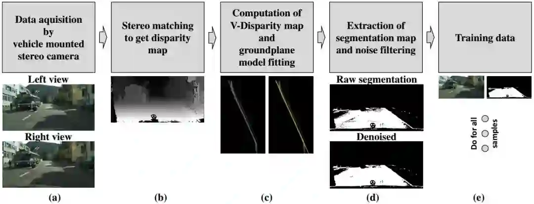 为了解决道路分割问题,我们提出了一种自动标注流程,利用确定性立体的地面检测方法,创建适合神经网络训练的大型数据集。