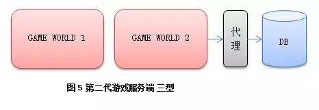 游戏服务器压力拆分后得意缓解,但是两台游戏服务器同时访问数据库,大量重复访问,大量数据交换,使得数据库成为下一个瓶颈。于是形成了数据库前端代理(DB Proxy),游戏服务器不直接访问数据库而是访问代理,再有代理访问数据库,同时提供内存级别的cache。早年 MySQL4之前没有提供存储过程,这个前端代理一般和 MySQL跑在同一台上,它转化游戏服务器发过来的高级数据操作指令,拆分成具体的数据库操作,一定程度上代替了存储过程: