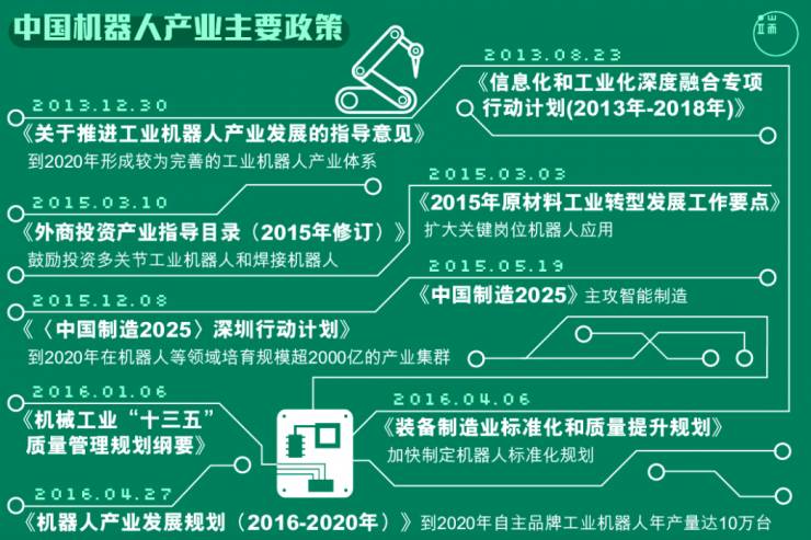 总理李克强提出的面向未来的制造战略计划《中国制造2025》(Made in China 2025)中,便将“工业机器人”列为重点发展对象之一。此外,在2016年4月由工信部、发改委、财政部联合印发的《机器人产业发展规划(2016-2020年)》中,明确提出“十三五”期间要大力机器人产业,使其跻身国际水平,取得重大突破。