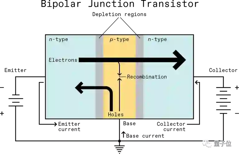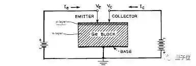 具体来说,这种晶体管基于拇指大小的N型锗板构建,其上带有过量的负电电子,经处理,表面会有一层薄薄的P层,上面带过量正电荷,底部接地。