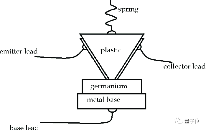 将两片相隔极小的金箔固定在一个塑料三角上,该部分连着一根弹簧,下方为半导体锗,两片金箔作为两个电极,与半导体材料轻轻接触。