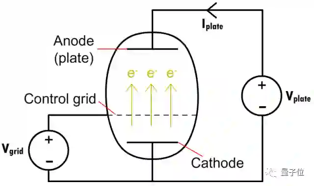 进一步,科学家们在阴极阳极之间添加一个栅极,利用同行电荷相斥,改变电子通过栅极流量,能够起到放大作用。由此,三极管诞生。
