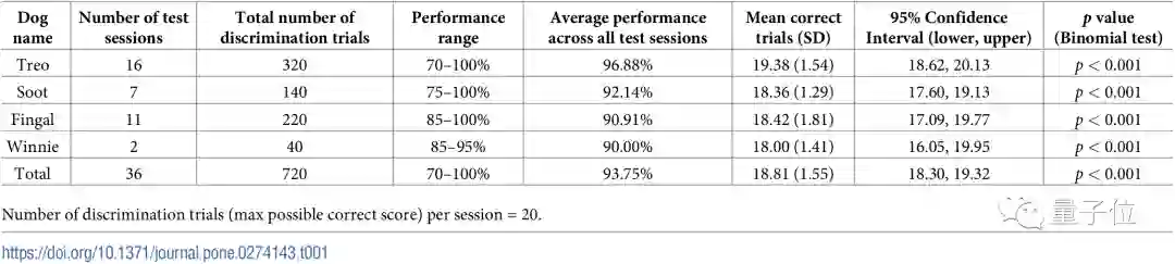 结果来看,4只狗狗中共计完成了36轮测试,其中最高的一只正确率可以达到96.88%,平均正确率达93.75%。