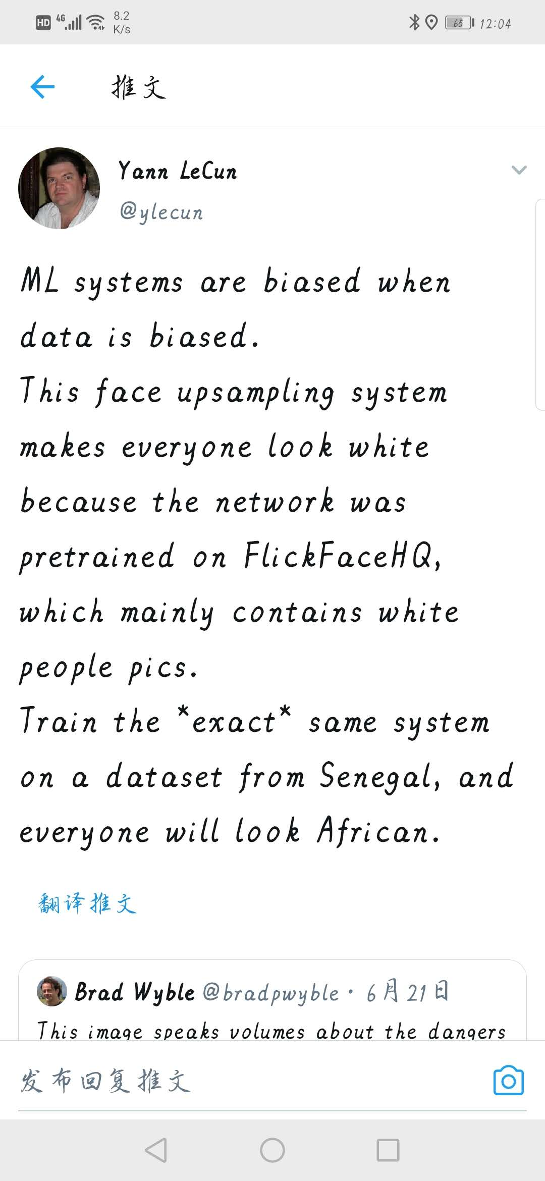一石激起千层浪,尤其是在这个特殊时期,有色人种被还原成白人的事挑起了大家对于 AI 系统产生偏见(bias)的批判,也再次警醒人们,AI 技术带有偏见所带来的潜在危机。