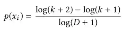 我们将用户表示学习看成一个多分类问题:从百万级待推荐文章中选择用户感兴趣的。在计算loss时,为了提升训练速度,采用负采样技术而不是传统的softmax。显然,如果我们随机挑选样本作为负样本,抽样分布将偏离真实情况。借鉴word2vec中NCE负采样的思路(见参考文献4),为了获得无偏分布,先将候选推荐item集合按照被点击的次数降序排列,然后计算每个item的概率,该概率依赖刚于讲到的item排序,具体计算公式如下:
