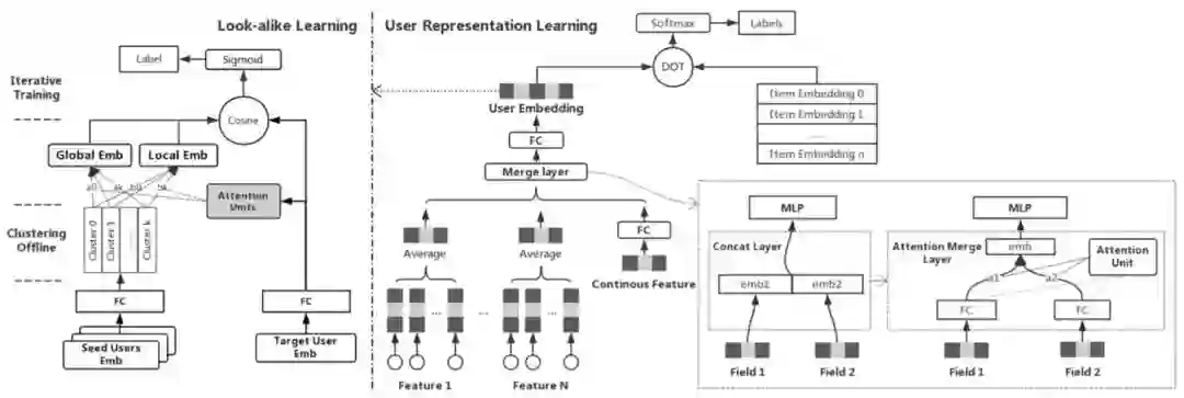 对于用户表示学习,论文提出了一种基于注意力融合层(attention merge layer)的新的神经网络结构取代经典的拼接层(concatenation layer),该网络结构大大提升了多特征学习的表达能力。在look-alike模型学习中,针对每个目标用户该论文设计了一个全局注意力单元(global attension unit)和局部注意力单元(local attention unit)来学习种子用户的鲁棒性自适应特征表示。最通过引入种子用户聚类方法,不仅减少了注意力模型预测的时间复杂度还减少了种子表示的信息损失。同时,构建了一个包含训练和在线服务的推荐系统,借助异步处理和种子聚类,在线预测才可以做到实时。