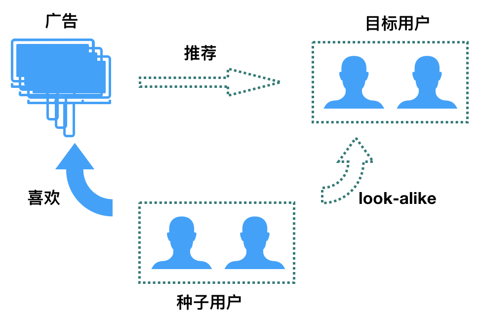 look-alike模型是一种流行的受众拓展(audience extension)技术(见参考文献2),大量应用于在线广告行业。对于一个待投放的广告(对于微信文章推荐,就是文章),点击过该广告的用户就是种子用户,look-alike方法就是基于一定的算法原理,找出候选用户集合(目标用户)中与种子用户相似的用户,将广告投放给这些相似用户的过程(见下面图2)。