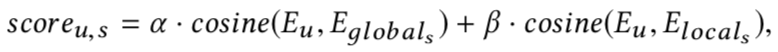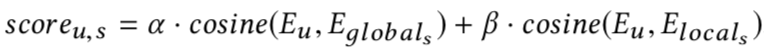 首先,受众拓展系统获取当前用户的look-alike嵌入表示,其次,对每个候选推荐文章,取该文章的种子用户的聚类中心嵌入表示作为look-alike模型的输入,look-alike模型通过全局注意单元预测种子的全局嵌入表示、通过局部注意单元预测种子的局部嵌入表示。最后,在线服务模块计算look-alike模型的全局和局部相似性(即当前用户与种子用户的全局和局部相似性)得分。对于用户 u 和 种子 s ,look-alike模型的得分为