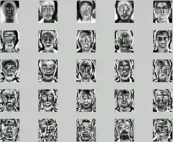 再把原来的人脸根据得到的平均脸做一些处理,得到了一系列 “ 特征脸 ”。