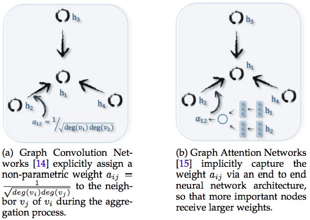 Graph Convolution Networks 使用卷积方式,实现点点融合和分层抽象。Convolution 卷积方式仅仅适用于融合相邻的点,而 attention 聚焦方式却不限于相邻的点,每个点可以融合整个图谱中所有其它点,不管是否相邻,是否融合如何融合,取决于点与点之间的关联强弱。