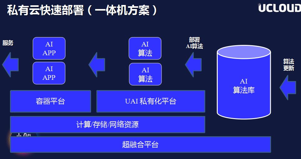 针对私有云方案的应用,范融列举了一个私有云接入层的具体案例,被称为一体机方案。如果用户有一个完整一体机,完全可以搭建自己的AI算法库,将算法库通过API调入到私有云中进行训练,训练出来的模型自动部署到在线服务平台上,然后与自己业务系统的微服务对接,这样一来用户生态私有云的布置就能快速部署完成。