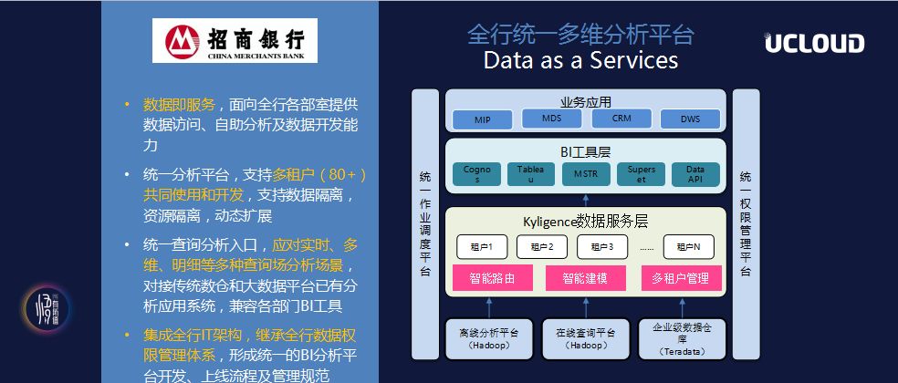 “不同的部门,例如信用卡部门、数仓部门、风控部门,数据不一致,主要是因为存在不同的平台上。如果通通放在一起就会发现,都放入Teradata中有点儿小贵,放在GreenPlum中并发度又不够,如果向Hadoop平台做迁移,作为全公司统一的数仓平台,分析的语义层模型能不能统一也是个问题。所以用麒麟做成一个统一的数据服务层,上面对接传统招行中使用的BI工具,包括Cognos、MSTR、Superset等,如此就形成了整个招商银行内部,80多个不同的部门使用的统一场景架构。”