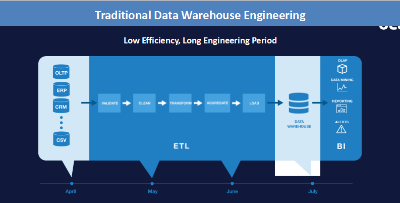 关于“数仓是如何建设的”问题,他在演讲中也有详尽提及。过去,传统数仓的建设需要从很多系统中读取数据,例如OLTP、ERP、CRM系统等,其中会涉及到很长的流程,还需要保证数据的整合、清理、过滤、语义一致性以及保持模型层的完整,最后的环节才是导入一个数仓中,然后对接整个前端的应用需求。