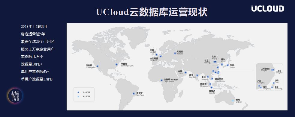 在最先“揭面”的Keynote的演讲环节中, UCloud关系型存储研发部负责人罗成对在“新一代公有云分布式数据库——UCloud Exodus”的主题分享中表示,在“用户的需求就是我们下一个产品”的理念影响下,从2013年UCloud推出第一款云数据产品MySQL至今,云数据库产品上线将近6年且保持稳定运营,有数据显示共覆盖全球29个可用区,服务上万家企业用户,实例数几万个,数据量达到10PB+,单用户最多实例数超过6千个,单用户数据量1.8PB。