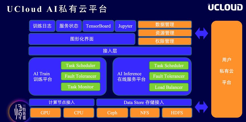 在讲解完公有云系统架构后,范融转而介绍私有云实施经验。凭借公有云上良好的分层模块的架构设计,API接入层、计算节点接入层、数据存储接入层将UCloud AI PaaS平台的核心组件全方位包围,使其能够方便的接入各类账号、资源、权限、数据管理组件,以此达到快速将公有云AI PaaS平台特性迁移部署到私有云的“环境迁移”需求。