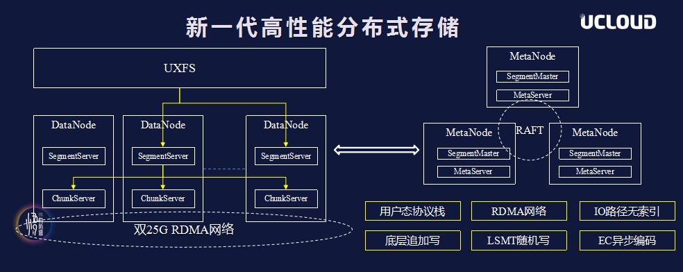 “前端接入的是UXFS,提供的是用户态的IO栈,当DB接入到UXFS之后,直接通过RDMA到存储节点。存储层细分为两层,上面一层是Segment Server,下一层是ChunkServer。