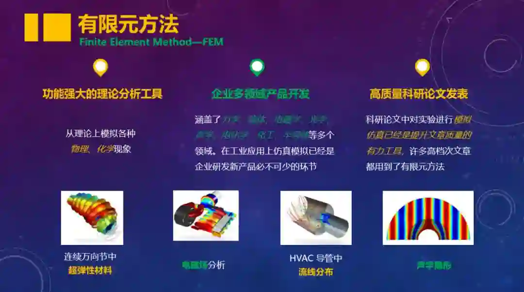 有限元方法的基本内涵,仿真模拟基本理论的讲解,以及该方法在科学研究中的广泛应用领域和重要意义,能够帮助科研人员解决的实际问题,不同仿真模拟软件(COMSOL ANSYS Abaqus)的特点和在科研上运用的优缺点比较;