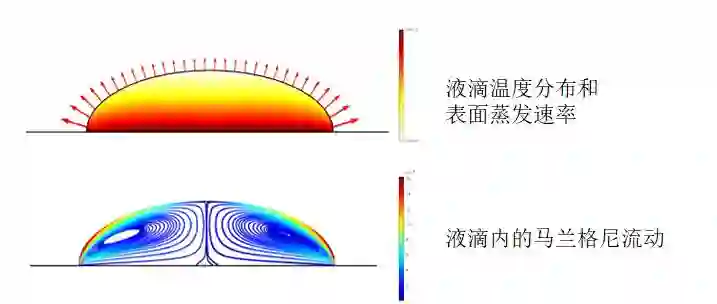 马兰格尼(Marangoni)效应是液体表面张力梯度引起的流体运动,液滴蒸发过程中的马兰格尼效应是非常经典的流体力学研究领域。液滴蒸发过程中一种马兰格尼效应产生的机理是这样的:蒸发蒸发产生的吸热效应会使液滴表面温度降低,液滴表面不同位置蒸发速率不同,导致了表面温度不同,温度梯度造成了表面张力的梯度进而形成马兰格尼效应。通过COMSOL Multiphysics 建模能同时计算蒸发、传热和表面张力梯度引起的流体流动。