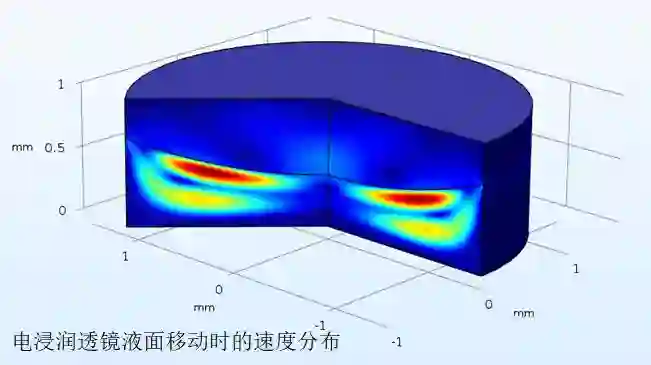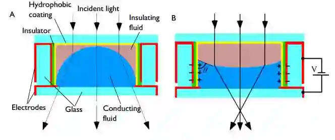 电浸润就是通过外加电场操控液滴在固体表面的接触角。在一个原本疏水的表面,液滴具有较大的接触角,当施加一定的电压能使接触角变小。通过电极的设计和不对称施加电场,就能定向操控液滴的运动。电浸润的另一种应用场景是制作变焦透镜,通过电压调节液滴表面的曲率实现透镜曲率的调节。