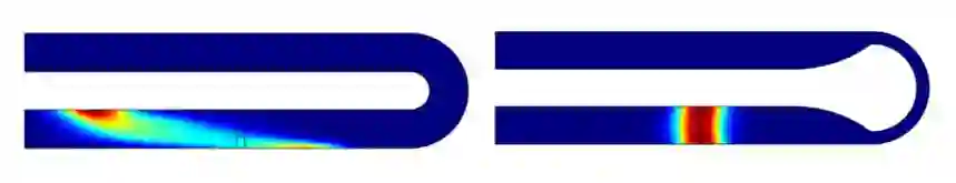 由于微流控器件尺度较小,使用外加电场的方式操控流体运动是目前主要的方法。其中电渗(Electroosmosis)是一种常用方法,外加电场施加在一个带电荷的表面(玻璃毛细管的内壁)或者多孔的固体介质的两端,驱动通道内的溶液以某一固定的速度流动。流动速度与壁表面电位和外加电场强度有关。COMSOL Multiphysics 内置了电渗流边界条件,可以非常方便的模拟电渗流问题。以下案例分析了一个U型电渗流器件中的溶质输运和扩散,使用模拟计算进行流体通道拐弯处几何优化,可以将弯曲引起的溶质弥散降至最低程度。
