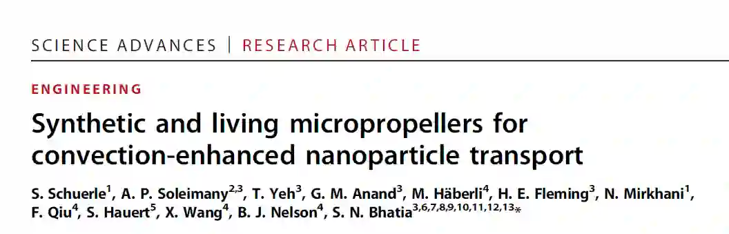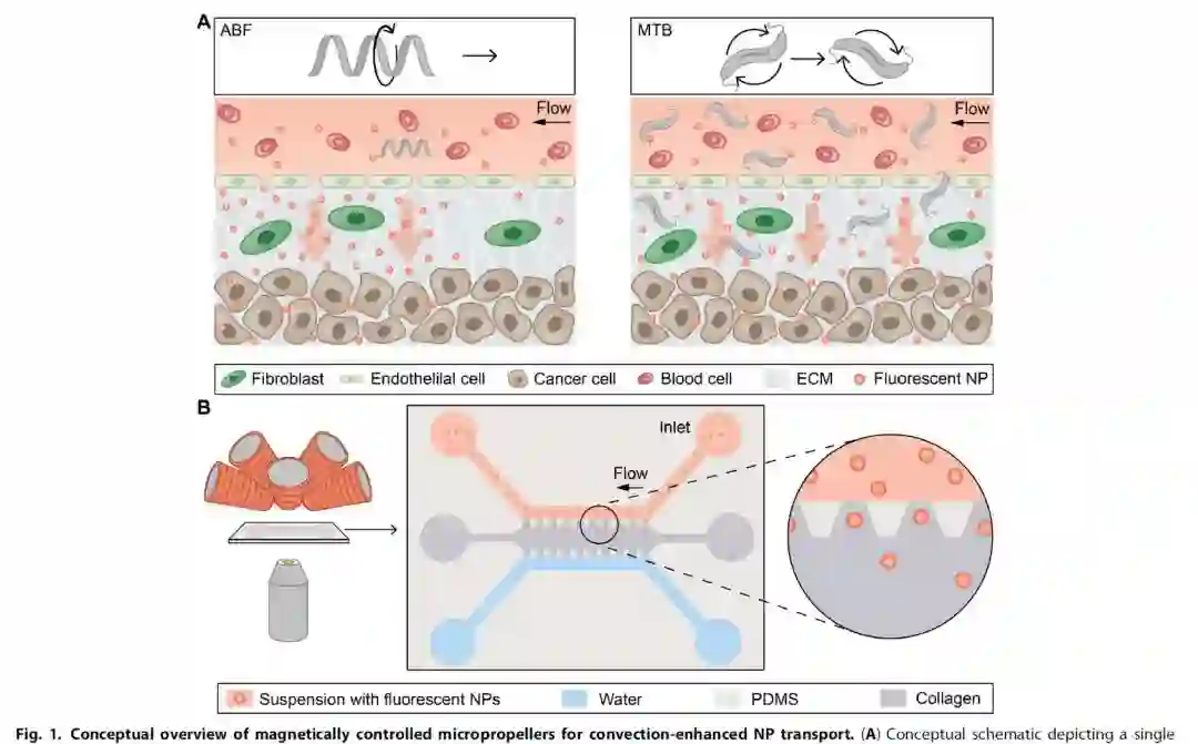 这篇文章报告了两个不同的用法由旋转磁场驱动的微型螺旋桨通过增强局部磁场来增加扩散受限的纳米粒子输运流体对流。在第一种方法中,我们使用了一种叫做人工细菌的合成磁性小机器人鞭毛(ABF), 在第二种方法中,我们使用了大量的趋磁细菌(MTB)来创建一个可定向的利用铁流体动力学“活铁流体”。这两种方法都增强了微流体模型中的纳米粒子输运由胶原基质包围的微通道组成的血液渗出和组织渗透。