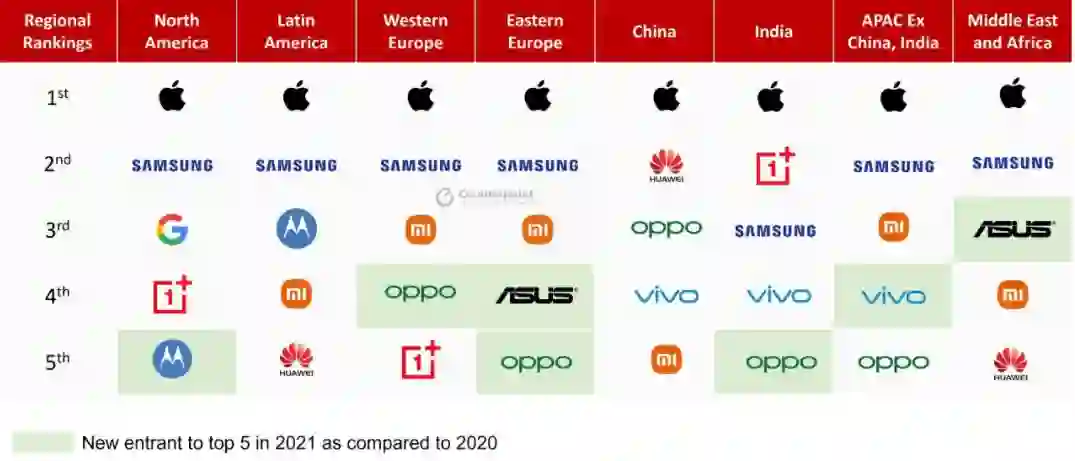 中国市场最受欢迎的高端品牌有苹果、华为、OPPO、vivo、小米(份额从高到低);美国市场有苹果、三星、谷歌、一加、摩托罗拉;西欧有苹果、三星、小米、OPPO、一加。