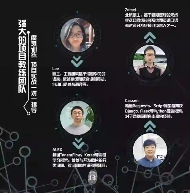 专业导师团都是国内人工智能领域的实战家、一线名企专家,他们将会全程授课。项目教练团都从事过三年左右算法工程师岗,日常就在做图像、NLP方面的算法研发工作。他们将带领学员进行8个开源项目的实战训练,全程一对一指导。更有清华大学教授,长江学者杨华中带队的顶级顾问团队为广大学员精心打造产品课程。