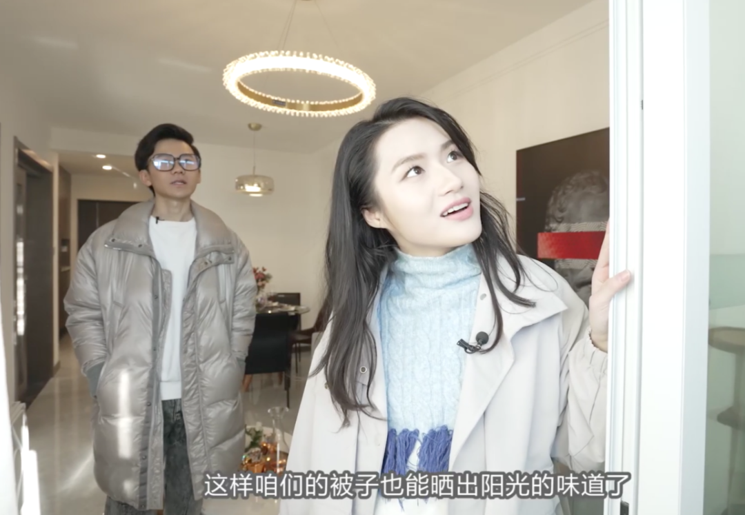 转身走到客厅,张先生还在感叹餐客一体的宽敞,彭女士立刻被客厅的阳台所吸引,快步走向前,果然发现了阳台预留了洗衣机的上下水位置。充足的阳光倾泻而下,意外的空间之喜也带动起体验官的生活想象。彭女士感叹「以后咱家的被子也能晒出阳光的味道了。」