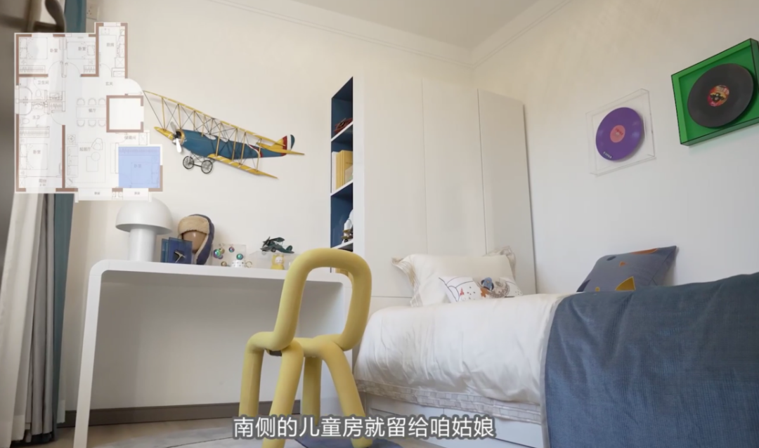 有飘窗的南向卧室,满足了郭女士女儿的公主梦。北向的另一间卧室可以根据孩子成长、家庭发展的不同阶段随意变换。郭女士考虑这既能放下孩子的钢琴,也可同时改成全家人共用的书房。
