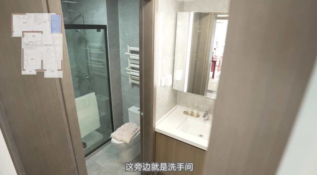 更引起他们注意的是,进门左手边是干湿三分离卫生间。干区是镜柜和一体式台下盆洗手柜,最大限度保证了洗漱用品以及化妆品的收纳,悬空设计则让扫地机器人来去轻松。湿区为马桶和玻璃隔断的淋浴间,洗漱、如厕、淋浴各自独立。