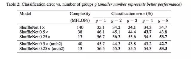 作者对于计算复杂度为 140 MFLOPs 、 40 MFLOPs、13 MFLOPs的 ShuffleNet 模型,在控制模型复杂度的同时对比了分组化逐点卷积的组数在1~8时分别对于性能的影响。从 表1 中可以看出,带有分组的(g>1)的网络的始终比不带分组(g=1)的网络的错误率低。作者观察到对于较小的网络(如 ShuffleNet 0.25x ),较大的分组会得到更好结果,认为更宽的通道对于小网络尤其重要。受这点启发,作者移除了网络第三阶段的两个结构单元,将节省下来的运算量用来增加网络宽度后,网络性能进一步提高。