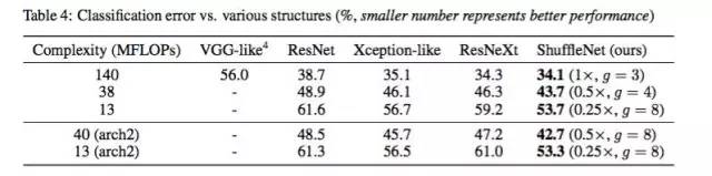 作者使用一样的整体网络布局,在保持计算复杂度的同时将 ShuffleNet 结构单元分别替换为 VGG-like、ResNet、Xception-like 和 ResNeXt 中的结构单元,使用完全一样训练方法。