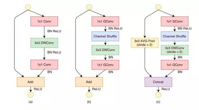 基于分组逐点卷积和通道重排操作,作者提出了全新的 ShuffleNet 结构单元,如图 2 所示。该结构继承了“残差网络”(ResNet)[3]的设计思想,在此基础上做出了一系列改进来提升模型的效率:首先,使用逐通道卷积替换原有的 3x3 卷积,降低卷积操作抽取空间特征的复杂度,如图 2(a)所示;接着,将原先结构中前后两个 1x1 逐点卷积分组化,并在两层之间添加通道重排操作,进一步降低卷积运算的跨通道计算量。最终的结构单元如图 2(b) 所示。类似地,文中还提出了另一种结构单元(图2(c)),专门用于特征图的降采样。