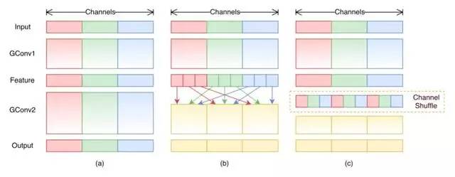 因此,在使用分组逐点卷积的同时,需要引入组间信息交换的机制。也就是说,对于第二层卷积而言,每个卷积核需要同时接收各组的特征作为输入,如图 1(b) 所示。作者指出,通过引入“通道重排”(channel shuffle,见图 1(c) )可以很方便地实现这一机制;并且由于通道重排操作是可导的,因此可以嵌在网络结构中实现端到端的学习。