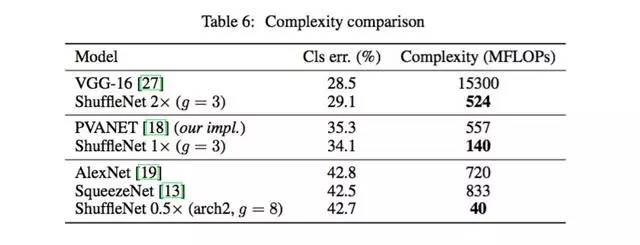 最近 Howard et al. 提出了 MobileNets [4],利用[1]里的逐通道卷积的设计移动设备上高效的网络结构。虽然 ShuffleNet 是为了小于 150 MFLOPs 的模型设计的,在增大到 MobileNet 的 500~600 MFLOPs 量级,依然优于 MobileNet。而在 40 MFLOPs 量级,ShuffleNet 比 MobileNet 错误率低 6.7%。详细结果可以从表3中得到。