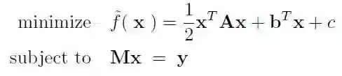 其中 A∈R^(d*d) 以及 M∈R^(p*d)。PGD 背后的思想是,消除等式约束 Mx = y(它定义了凸集 C),从而得到一个无约束的优化问题。首先,我们需要找到一个矩阵 F∈R^(d*(d-p)) 和用参数表示的仿射向量 x^d(因此为凸集),可行解集如下: