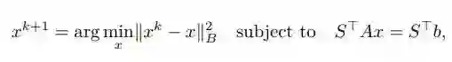 直观地看,由于我们认为原系统 Ax = b 很复杂,我们可以用一个更简单的系统替换它——一个随机的原始系统的草图,其解集 {x | S^T Ax = S^T b} 包了含所有的原始系统的解。x^(k + 1) 可以被认为是最接近 x^k 的点,它可以作为原始版本的线性系统的解。草图系统通常会有很多的解,为了找到最好的 x^(k + 1),我们需要一种方法从解集中来选择它。这个想法需要试图保留尽可能多的目前学到的信息,这些信息是在当前的点 x^k 上提炼而来的。
