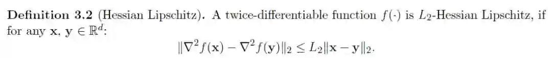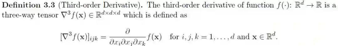 Anandkumar 和 Ge(2016)引入了上述定义,Carmon et al.(2017)也将三阶导数 Lipschitz 称为三阶平滑度。三阶导数 Lipschitz 和三阶平滑这两个术语在下面的章节中可以互换使用。