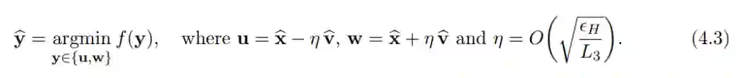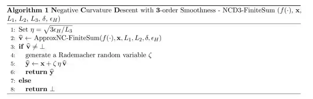 在这里,ApproxNC-FiniteSum(·) 函数是利用随机梯度或随机 Hessian 向量积求负曲率方向的函数。该函数会返回一个向量 v^,它是从当前点 x 开始的一个负的下降方向。请注意,我们还可以通过其它方法找到这个向量,即使用 Mokhtari、Ozdaglar 和 Jadbabaie 提出的方法。