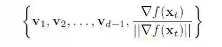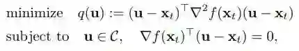 这一步所得的结果(28)是一个众所周知的问题,可以使用标准的优化技术来解决。从(26)到(28)的转换背后的思路是:由于切线方向▽ f(x_t)∈R^d,我们可以让它作为 R^d 的一个基向量。剩下的 A 的列构成的基向量形成了向量空间 R^(d-1),他们都正交于切线方向。通过在 A 的列空间中搜索向量,即,z = Ay,这样可以保证得到满足约束▽ f(x_t)(u - x_t) = 0 的解。
